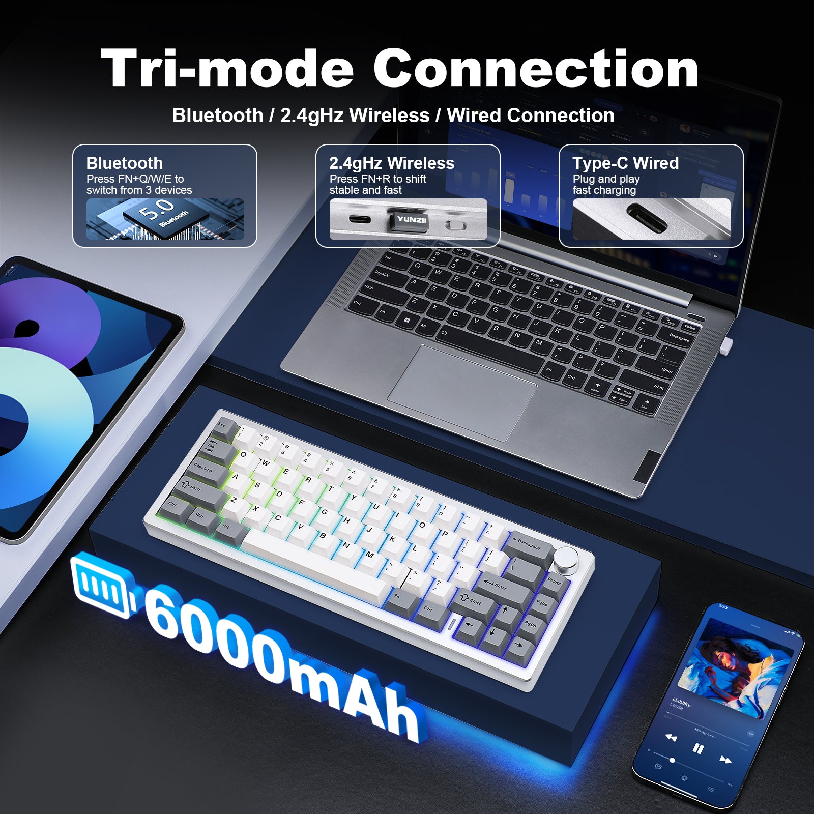 Stay connected across multiple devices with AL68. This wireless keyboard supports tri-mode connectivity—Bluetooth, 2.4G wireless, and USB wired, making it compatible with Mac, Windows, Linux, and more. Switch seamlessly between up to 5 devices, whether you’re using a tablet, laptop, PC, or smartphone. Build-in 6000mAh battery, enjoy up to 4 days of uninterrupted use when there is no RGB, making it the perfect companion for on-the-go productivity and gaming.