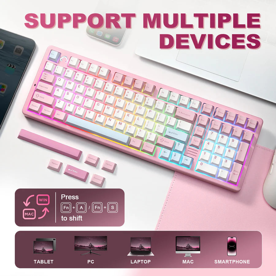 The YUNZII AL98 wireless gaming keyboard features versatile tri-mode connectivity (Bluetooth 5.0/2.4GHz/USB-C) with seamless switching between up to 5 devices and multiple systems (including Windows, Mac, Android, etc.). A built-in 8000mAh battery delivers exceptional endurance for both extended work sessions and immersive gaming. This Bluetooth keyboard can free you from frequent charging interruptions.